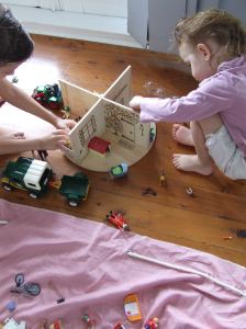 Here it is, the new house, foldable, made out of  plywood and decorated with a woodburner; the children are loooooving it!
