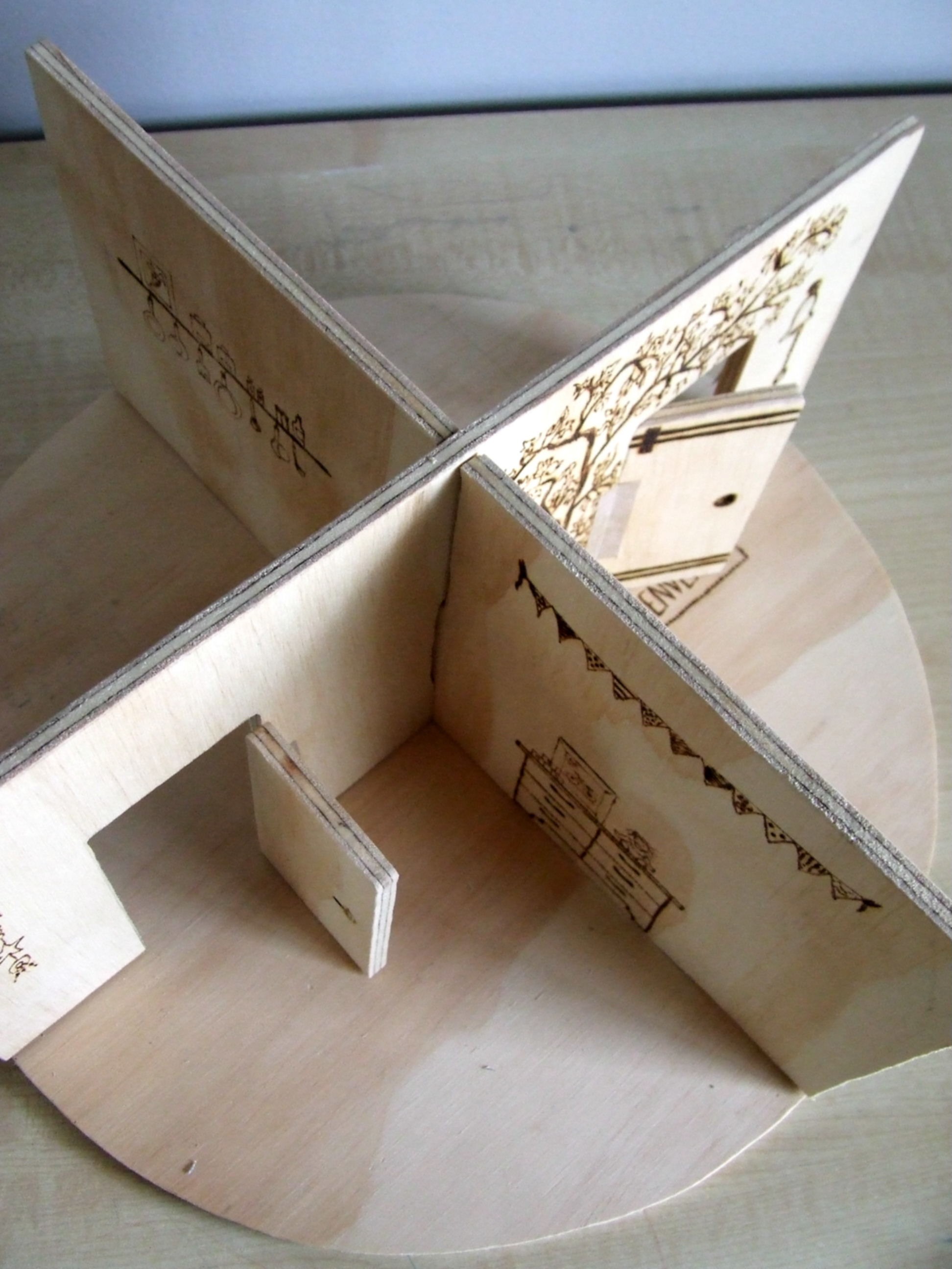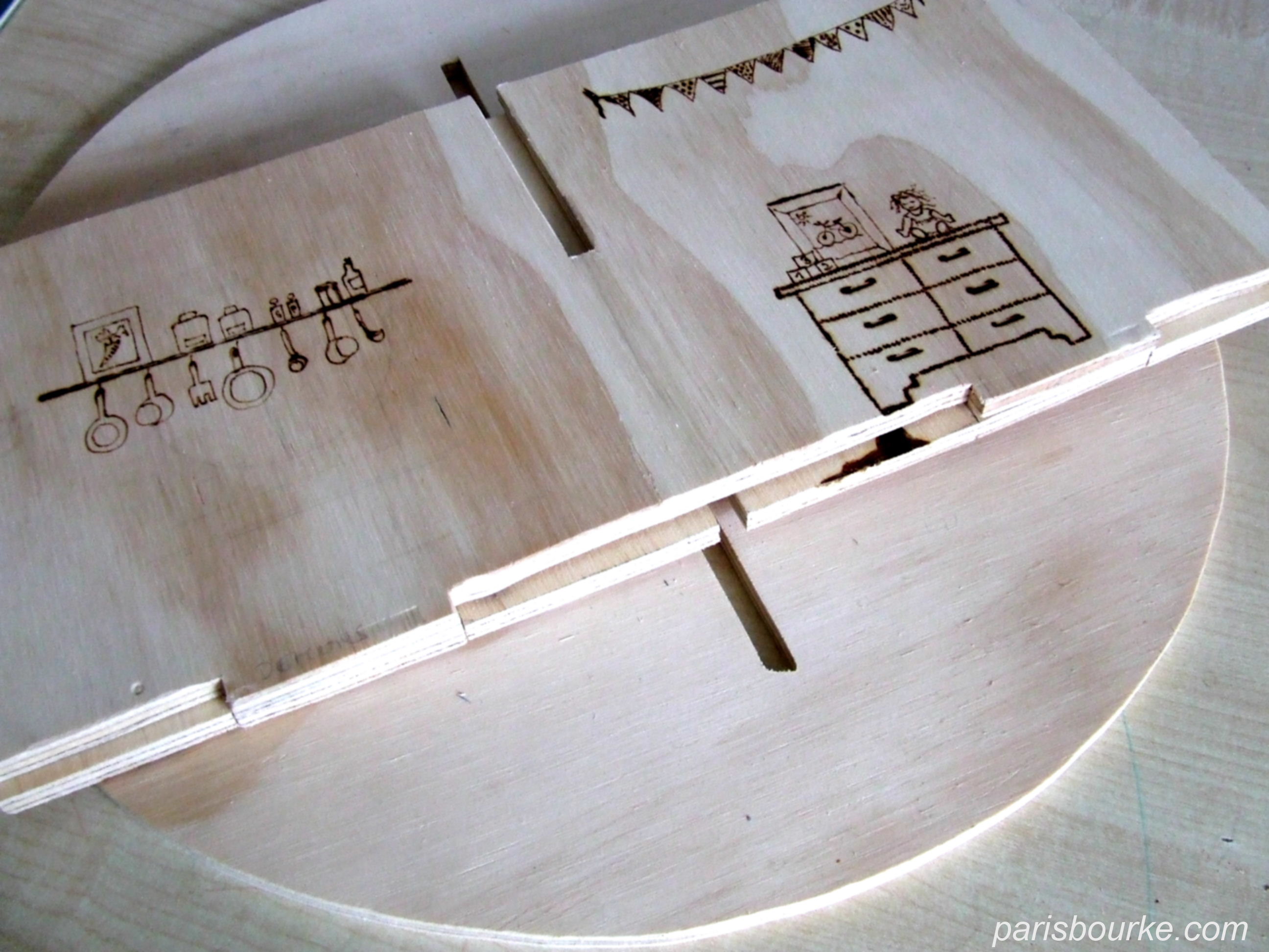 La voici donc, la nouvelle demeure, entièrement démontable, fabriquée dans du contre-plaqué et décorée au pyrograveur; les enfants adoooorent!