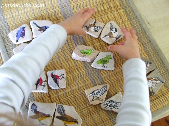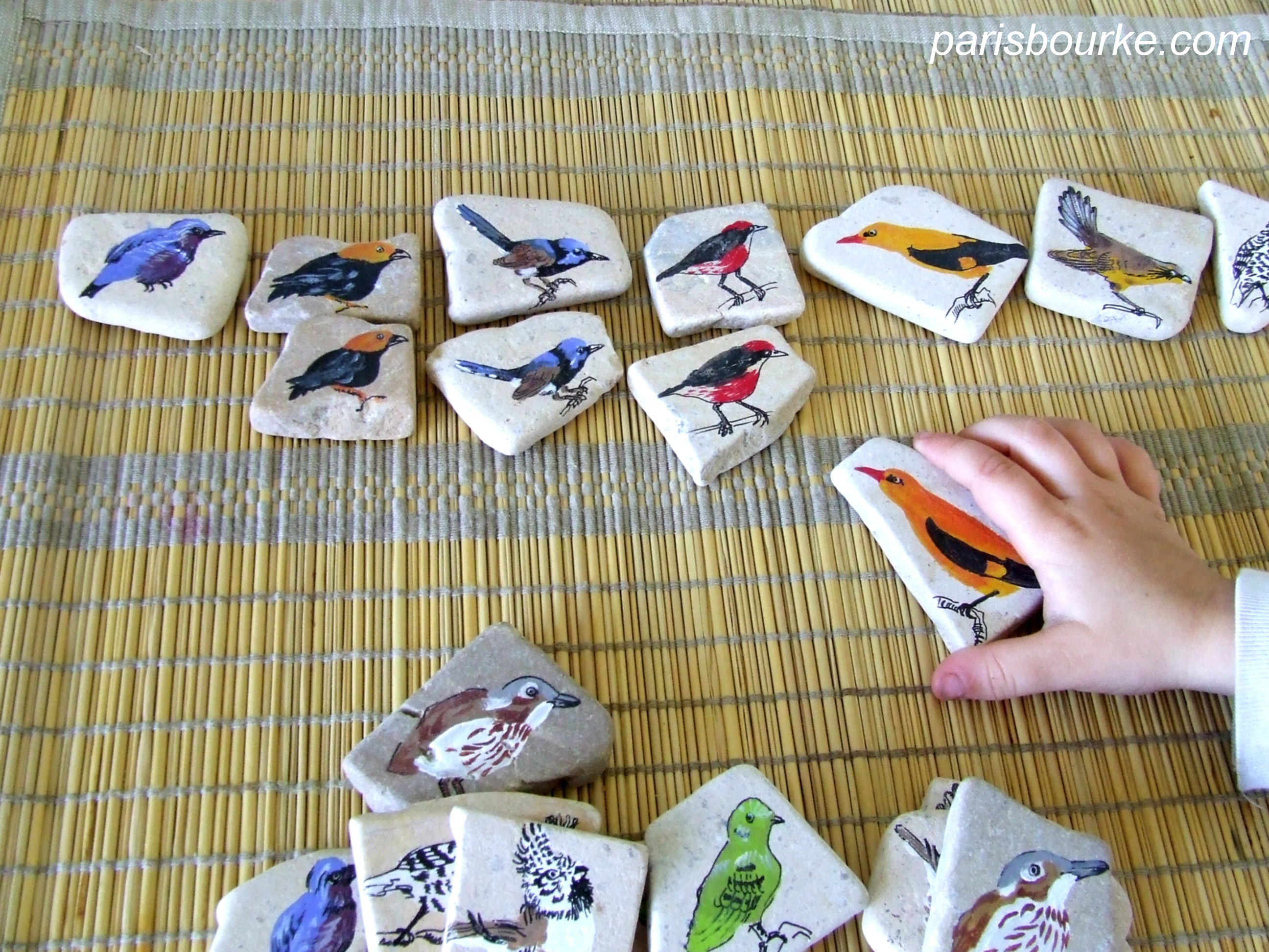 J’ai repris mes cailloux plats pour peindre quelques oiseaux et en faire un autre jeu de mémoire pour les enfants (un peu comme celui des insectes.)Ils vont vite connaitre les noms des oiseaux!