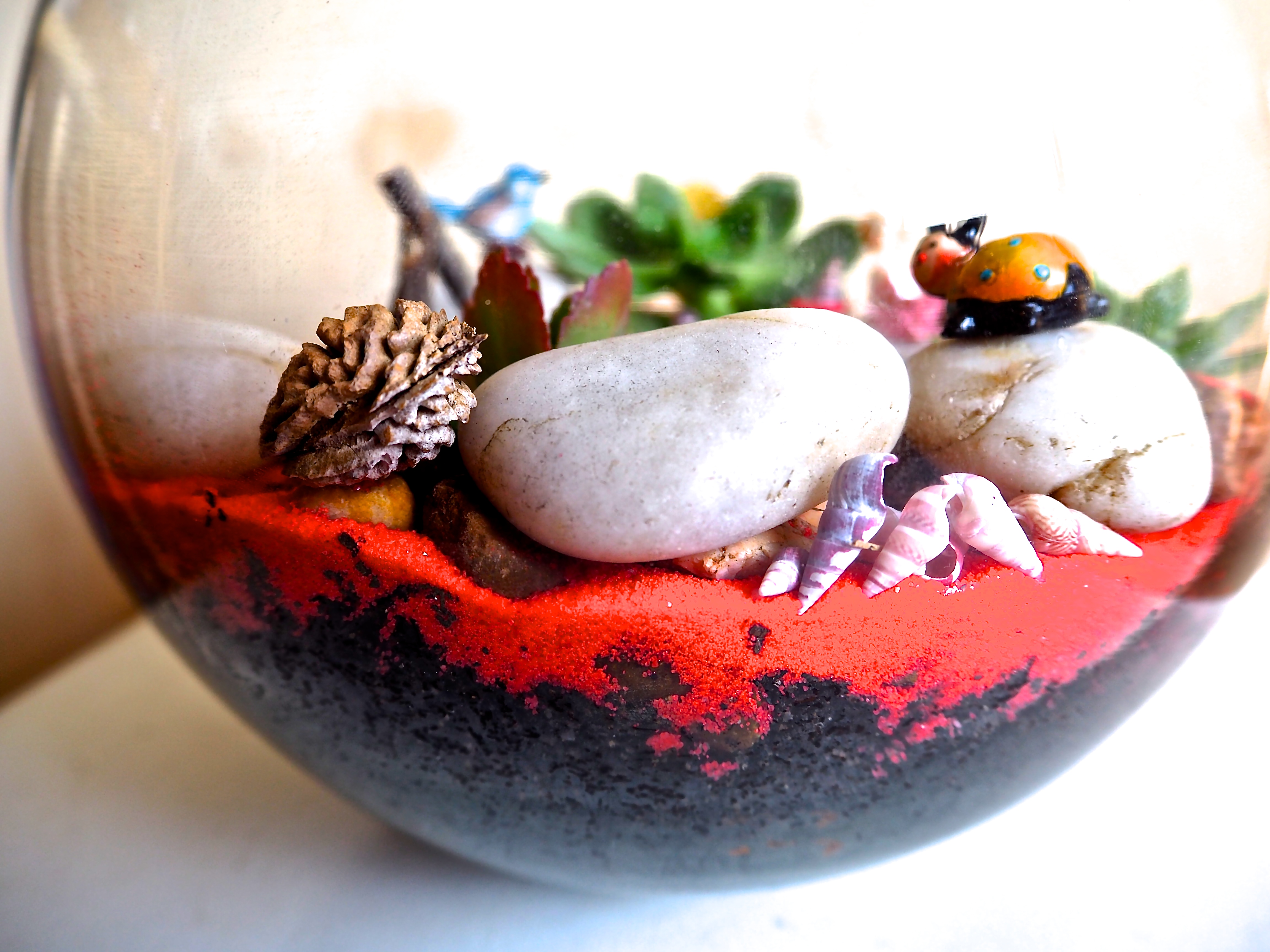 The latest project for those rainy and cold winter days: build a terrarium! Before assembling it, we went to the beach to collect tiny seashells, to the river to collect peebles, a few acorns from the park and some red sand from our hourglass collection. Next time we are heading to the forest, we will collect a bit of moss. Meanwhile, here is the beginning of our tiny garden for fairies, blue wren and ladybug :