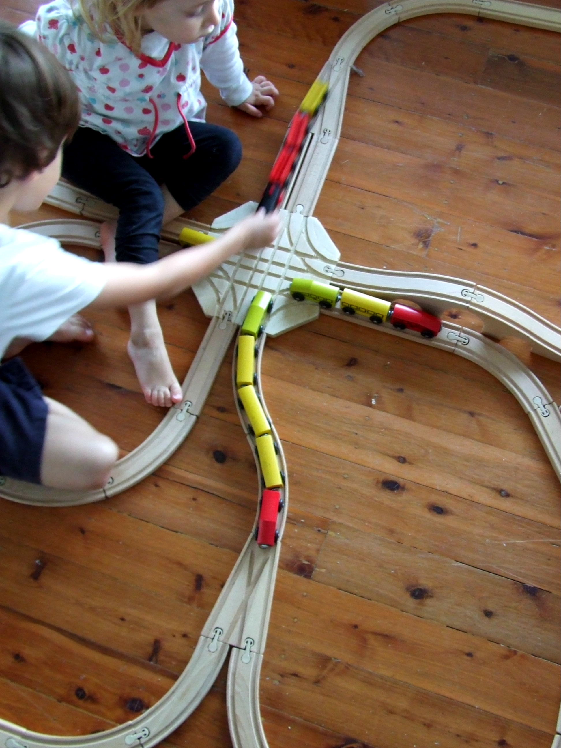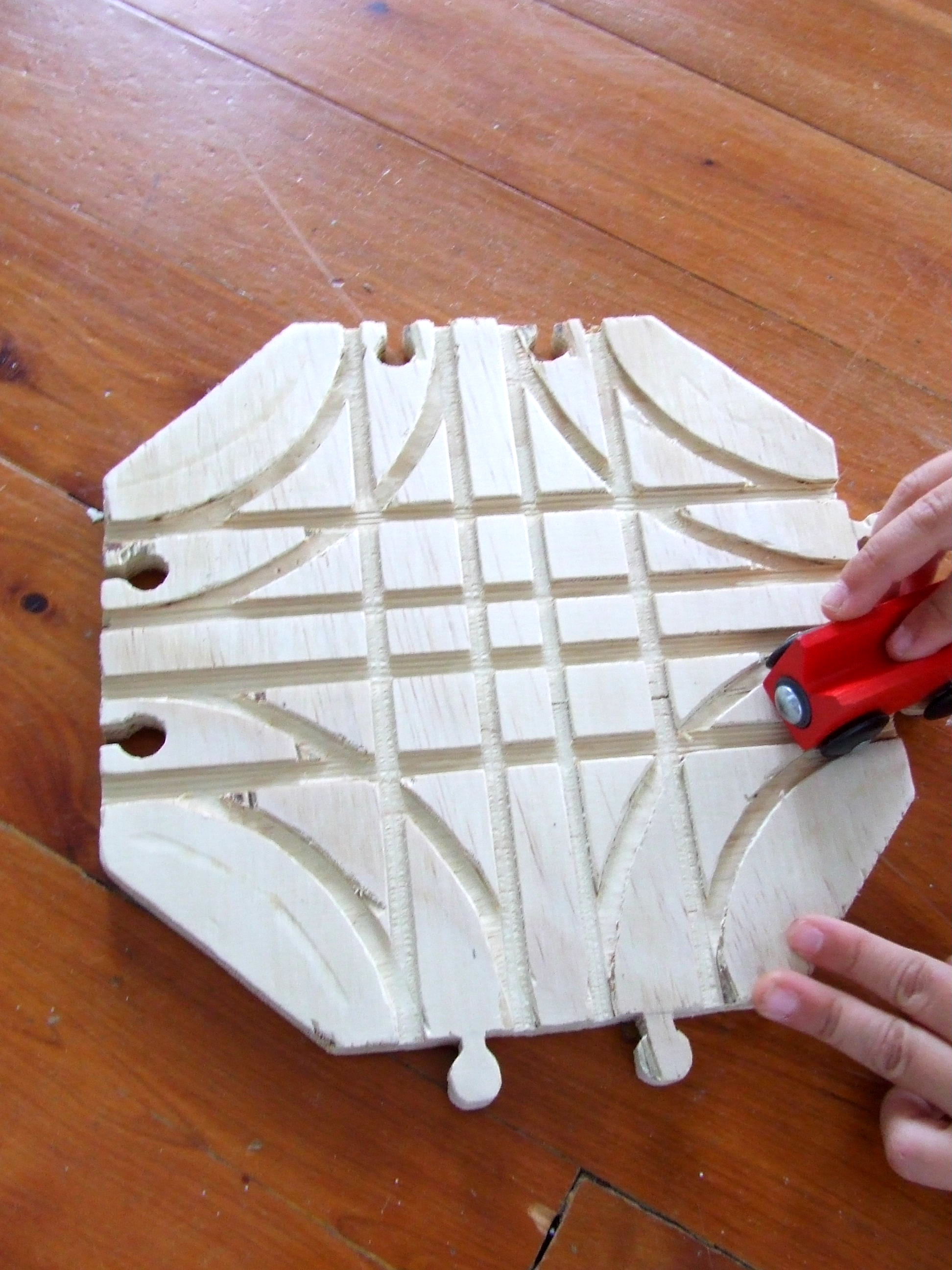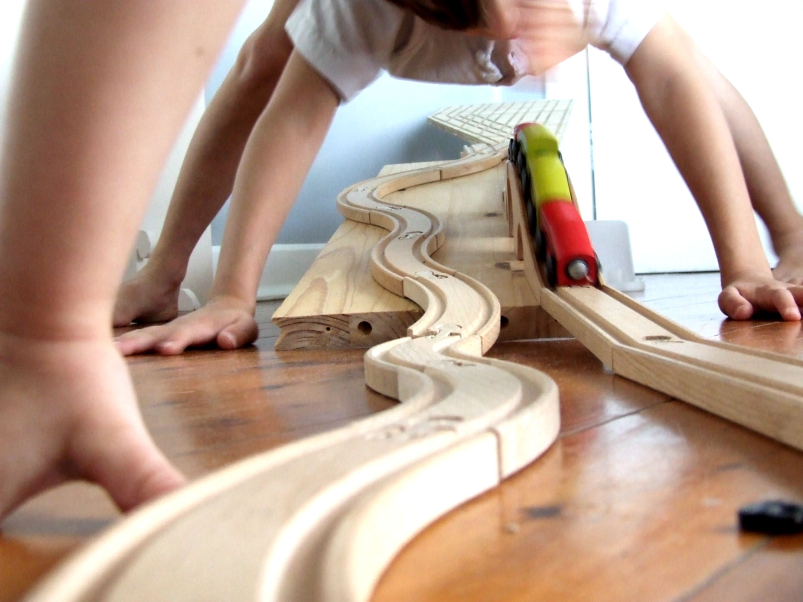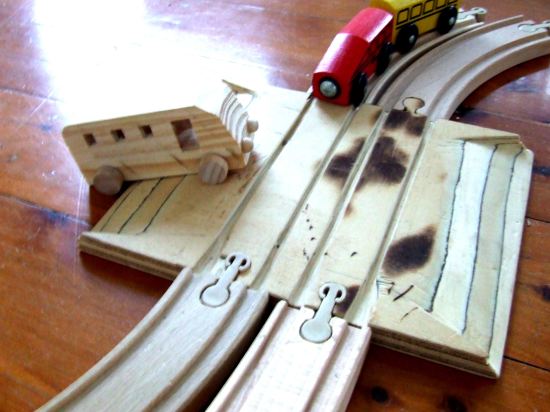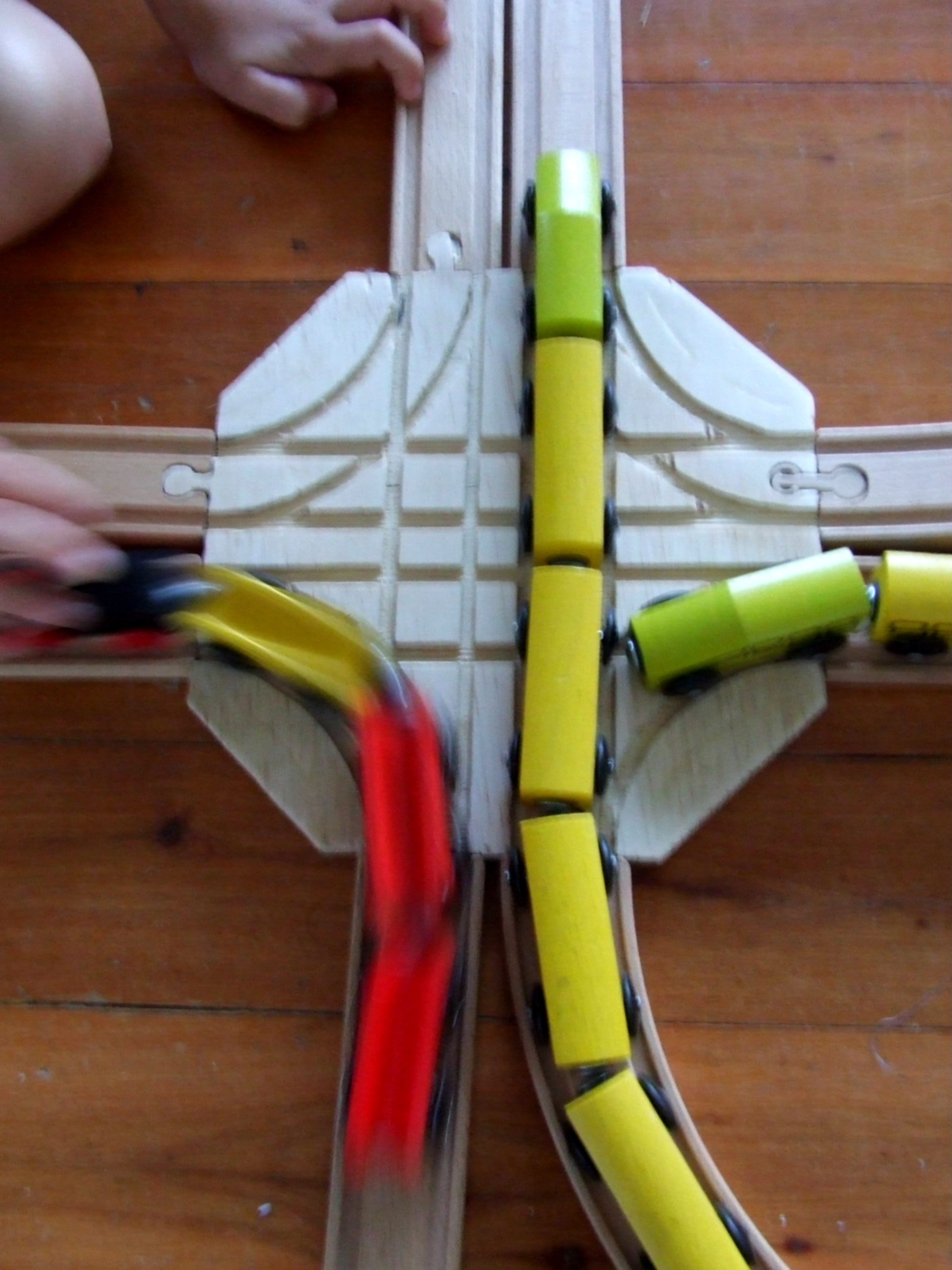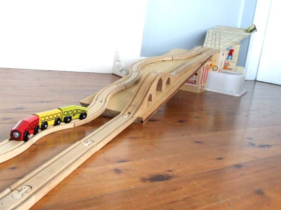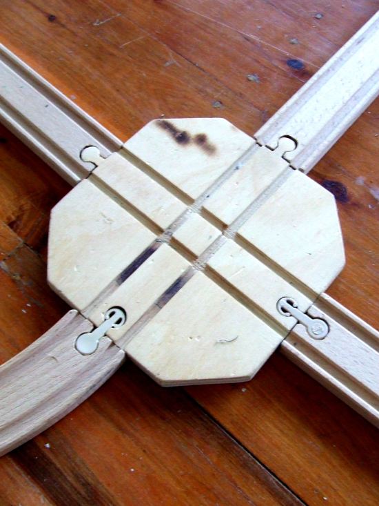 Chez nous, quand le papa s’enferme avec sa scie circulaire pour 1 heure, voilà avec quoi il en ressort: des passages à niveau, des croisements et des échangeurs pour le train en bois des mimis! J’en ai la mâchoire qui tombe et vous?